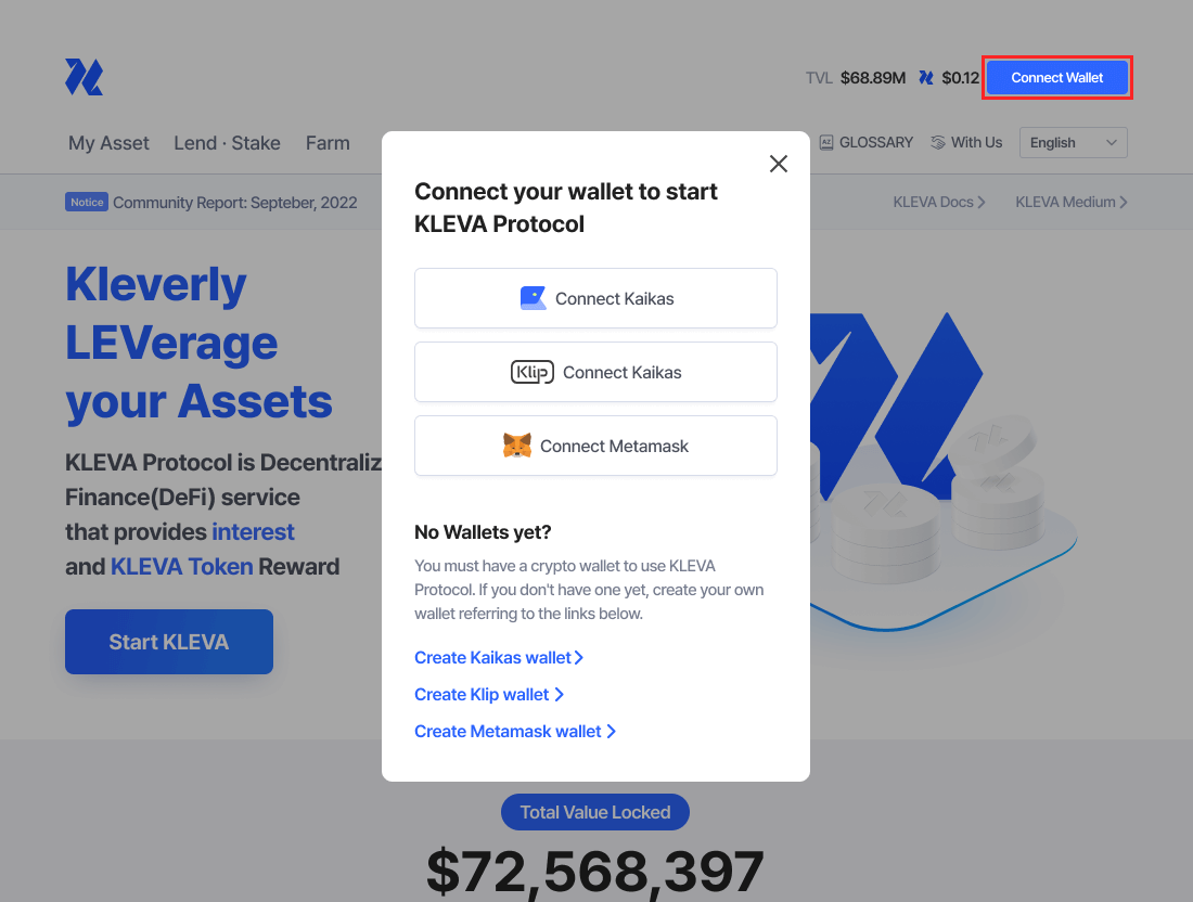 ### <mark style="color:blue;">Connecting Wallet to KLEVA Protocol (PC)</mark>