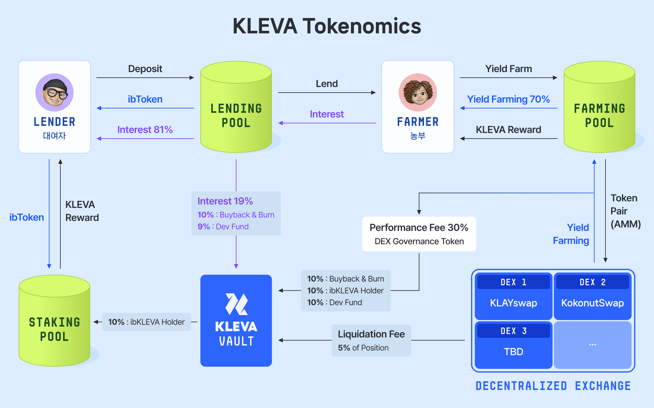 52.6% of the fee revenue from interest earned by borrowers: KLEVA token Buyback & Burn.